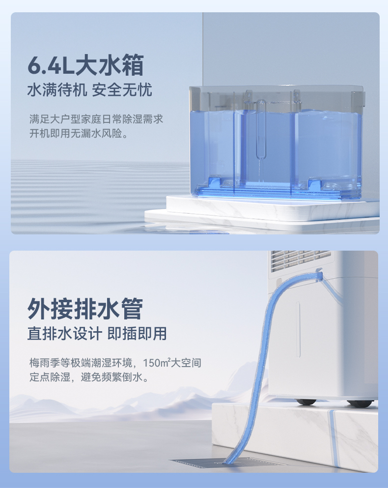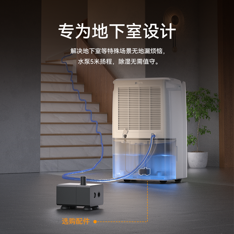 最大除湿量60升/天,采用R290冷媒,可匹配专用水泵扬程5m,适用面积80~100㎡
